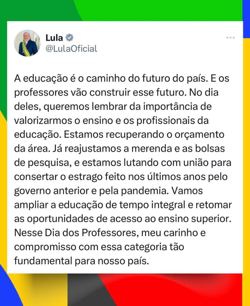 “A educação é o caminho do futuro do país. E os professores vão construir esse futuro. No dia deles, queremos lembrar da importância de valorizarmos o ensino e os profissionais da educação. Estamos recuperando o orçamento da área. Já reajustamos a merenda e as bolsas de pesquisa, e estamos lutando com união para consertar o estrago feito nos últimos anos pelo governo anterior e pela pandemia”, escreveu.